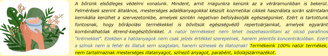 Az MSM & Rozmaring krém egy kiváló kiegészítője az Fekete Nadálytő készítményünknek, amellyel felváltva is alkalmazható. Nappali használatra inkább az MSM & Rozmaring krémet, éjszakai használatra pedig inkább a Fekete Nadálytő krémet javasoljuk.