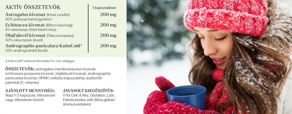 - A KalmCold® kivonatban 7 egyedülálló bioaktív összetevőt kombinálnak, hogy megbirkózzanak a megfázás és az influenza kellemetlen tüneteivel: tüsszögés, orrfolyás, láz, torokfájás, fejfájás, hurutos köhögés, fáradtság, fülfájás. Hatékonysága már 3 nap alatt megfigyelhető, alacsony, napi 200 mg-os dózissal.