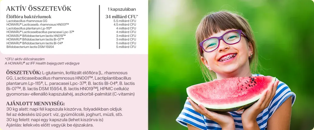 A gyermekek fizikai és lelki egészségének védelmében fontos szerepe van a bélflóra egészségének. A rosszul működő bélrendszer tünetei közé tartozik a kellemetlen emésztés, gyomorfájás, rossz tápanyag-felszívódás, gyenge immunitás, alvás és hangulati ingadozások, továbbá az általános fáradtság. Kifejezetten a gyermekek részére fejlesztett termékünknél a célunk az volt, hogy olyan probiotikus baktériumtörzs kombinációt hozzunk létre, amely segít helyreállítani a bélflóra egyensúlyát, az immunrendszer hatékony működését, csökkenti az emésztési zavarok, úgymint hasmenés, székrekedés, gyomorgörcs, gázképződés, ételallergia előfordulási gyakoriságát, továbbá támogatja a bélflóra helyreállítását antibiotikum kúra alatt és azt követően is.