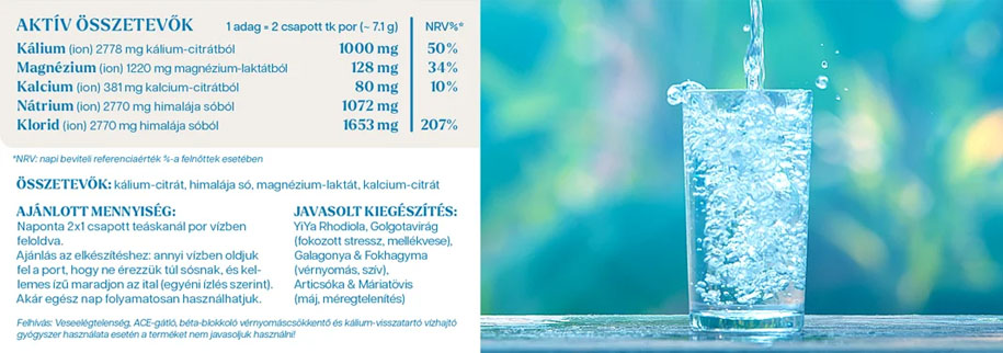 - KÁLIUM (K+) Az intracelluláris tér fontos elektrolitja, a szív, a vese, az emésztőrendszer funkcióihoz nélkülözhetetlen. A nyugati típusú táplálkozásban nagyon gyakori az elégtelen káliumbevitel, az optimálisan ajánlott napi 4700 mg kálium alig felét fogyasztjuk el étkezéssel, ezért pótolni érdemes. A magas káliumfogyasztásnak számos pozitív hatása igazolt. Nagy mintás vizsgálatok szerint 20%-kal csökkenti a szív- és érrendszeri betegségek kockázatát. Segíti a szívizomzat összehúzódását, a normál szívritmus és pulzus fenntartását, és csökkenti a sztrók és magas vérnyomás kockázatát. Megvédi az izomtömeg elvesztését, segít megőrizni a csontok ásványi anyag sűrűségét és csökkenti a vesekövek képződését. Hozzájárul az egészséges vércukorszinthez. Ellensúlyozza a túlzott sófogyasztást.Hiányának lehetséges tünetei: a vesekőre való hajlam, az inzulin-rezisztencia lehetőségének kialakulása növekszik, fokozott édesség iránti vágy, fáradtság, székrekedés, görcsök, légszomj tünetek jelentkezhetnek. 1 liternyi vizelet ürítése során akár 2 g kálium is távozhat a szervezetünkből.