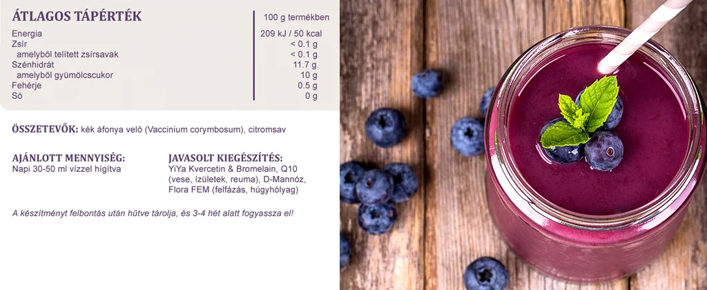 A kék áfonya a lehető legtermészetközelibb formájában, direkt présléként érhető el termékkínálatunkban (hozzáadott víz és cukor nélkül), így a mindennapok teljes értékű táplálékává válhat. Az ízvilág közkedvelt oldalát képviseli, kifejezetten kellemes, édes jegyekkel bír, ezért a gyermekek számára is könnyen adagolható.Kiváló kiegészítése lehet további bogyós velőinknek. Tökéletes 4 évszakos táplálék, flavonoidokban és C-vitaminban gazdag, frissítő szuper élelmiszerként szolgál szervezetünknek. Az áfonyalevet rövid ideig enyhén hőkezeltük (60 Celsius fokon) a szavatosság megőrzése érdekében. Felbontás után hűtőben tároljuk, és maximum 4 hét alatt fogyasszuk el!