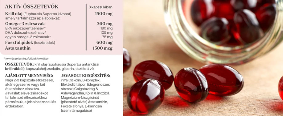 - A krill olaj kiemelkedő képessége, hogy a benne található foszfolipid omega-3 zsírsavak sokkal könnyebben jutnak el az agyi szövetekig, mint a hagyományos halolaj omega-3 zsírsavak. Kisebb mennyiség is elég belőle, így gyerekek számára is könnyen fogyasztható.