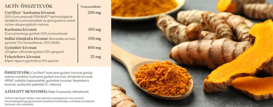 A kurkuma, tömjénfa, gyömbér és feketebors kivonatok hatékonyan veszik fel a harcot az alacsony szintű (rejtett) gyulladással, amely nagyon sok krónikus egészségügyi probléma kialakulásáért felelős. A CurQfen® egy szabadalmaztatott, vízben diszpergálódó, mesterséges adalékanyag-mentes kurkuma kivonat, amelynek véráramba történő felszívódása sokszorosa (szabad, nem konjugált kurkuminoidok esetén 45-szeres felszívódás), mint a hagyományos kurkuma kivonatoké, ezáltal a gyulladás csökkentésében, az idegrendszer, az agy és az ízületek védelmében hatékonyabban fejti ki hatását. (további információ: a CurQfen® összetevőről)