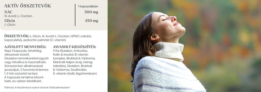 - Az Acetil-L-Cisztein növeli a szervezet glutation-szintjeit, antioxidáns hatása révén fokozza az immunrendszer működését, segíti a sejtszintű regenerációt és gyulladáscsökkentést, hozzájárul a toxinok, méreganyagok hatékony kivezetéséhez.