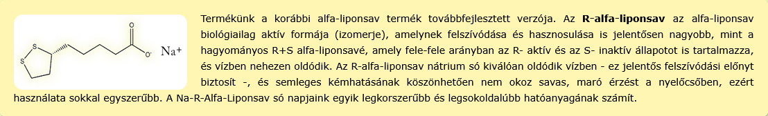 Az r-alfa-liponsavat napjaink egyik legsokoldalúbb antioxidánsának tartják. Zsírban és vízben egyaránt oldódó molekula, áthatol a sejtmembránon, ezáltal szervezetünk minden egyes sejtjébe képes eljutni. Antioxidánsként újrahasznosítja a többi antioxidánst, például C-, E-vitamint és Q10-et, valamint szervezetünk legfőbb saját antioxidánsát, a glutationt. Inzulin-utánzó anyag, támogatja az egészséges vércukorszintet. Németországban orvosok használják a kórosan magas vércukorszint káros szövődményének, a végtagok fájdalommal, és zavaró idegirritációval járó problémájának kiegészítő kezelésére.