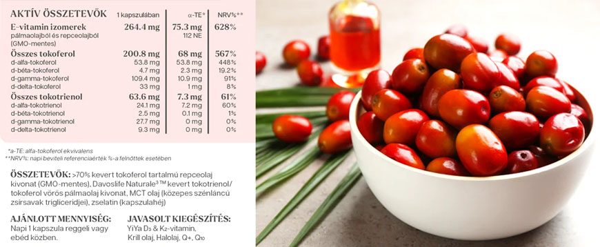 A Natural E3® a maláj DavosLife™ cég vörös pálmaolajból kinyert E-vitamin izomer koncentrátuma. Természetes arányban tartalmazza az összes tokotrienol molekulát. A pálmaültetvényük környezeti szennyezésektől védett vegetáció, az elkészült kivonat mesterséges adalékanyagoktól és szennyezésektől mentes.