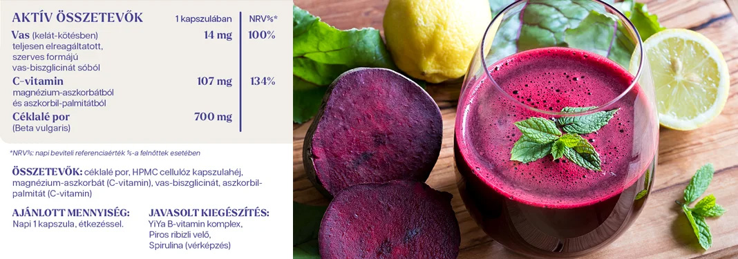 Ezért is véltük kiemelkedő fontosságúnak, hogy egy megbízható minőségű terméket hozzunk létre, megfelelő felvilágosítás mellet A Vas-biszglicinát a vas glicin aminosavval alkotott sója, amelyet remekül tud hasznosítani a szervezet. Termékünket továbbá céklalé porral, és magnézium-aszkorbátból származó C-vitaminnal kombináltuk a fokozott felszívódás érdekében.